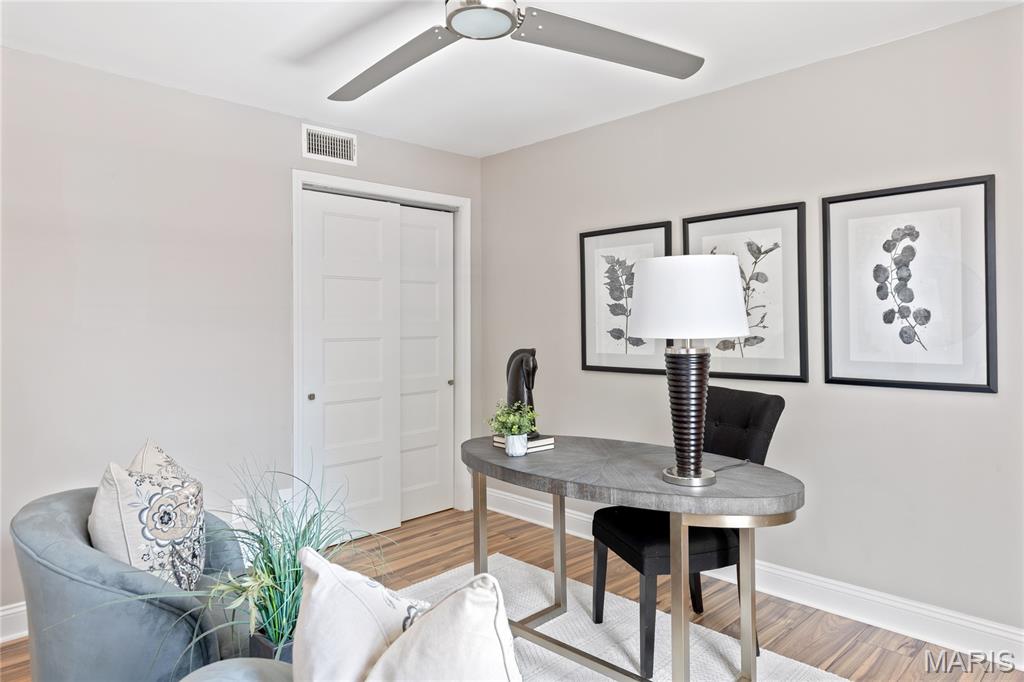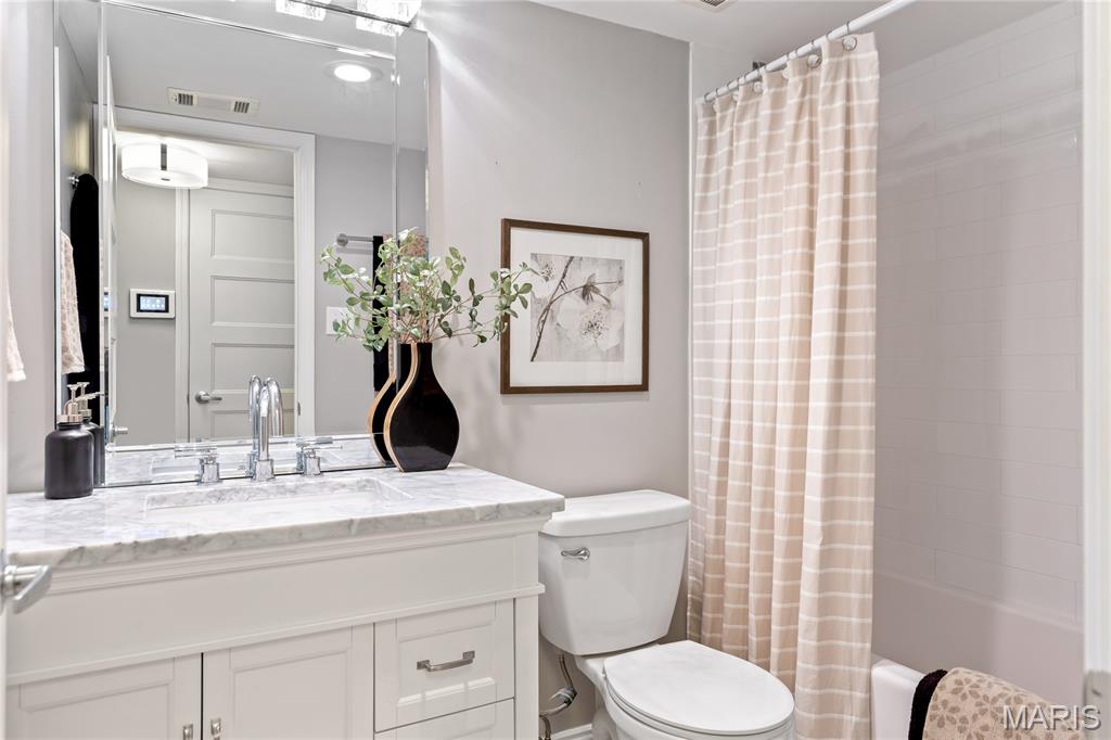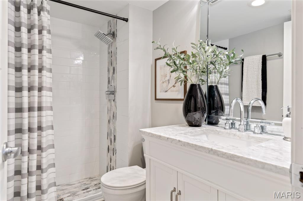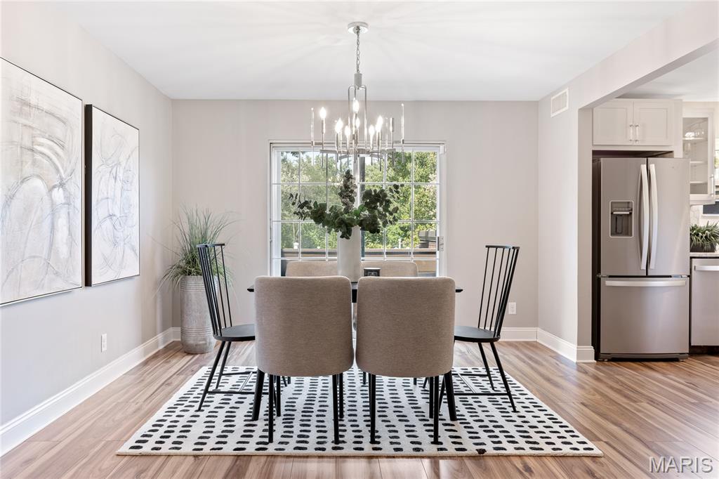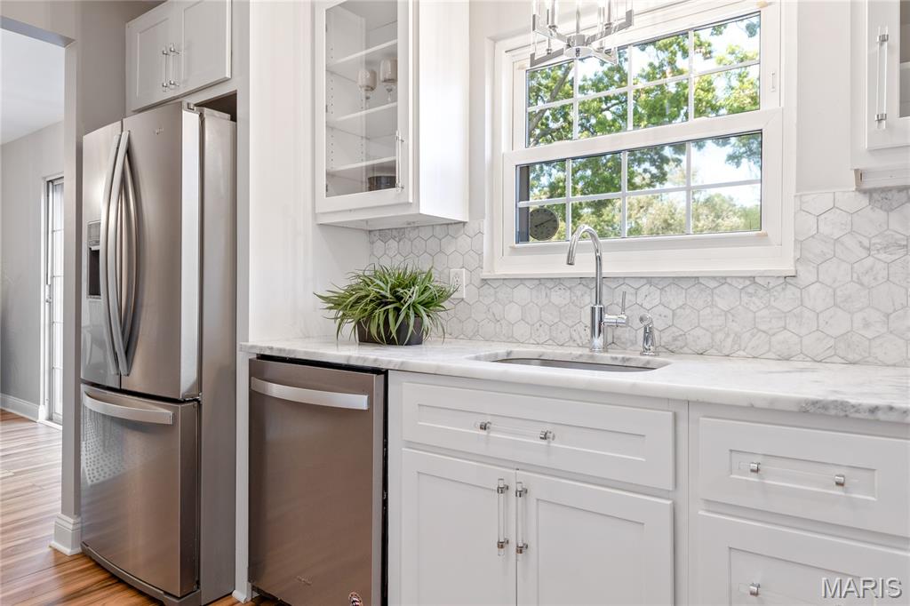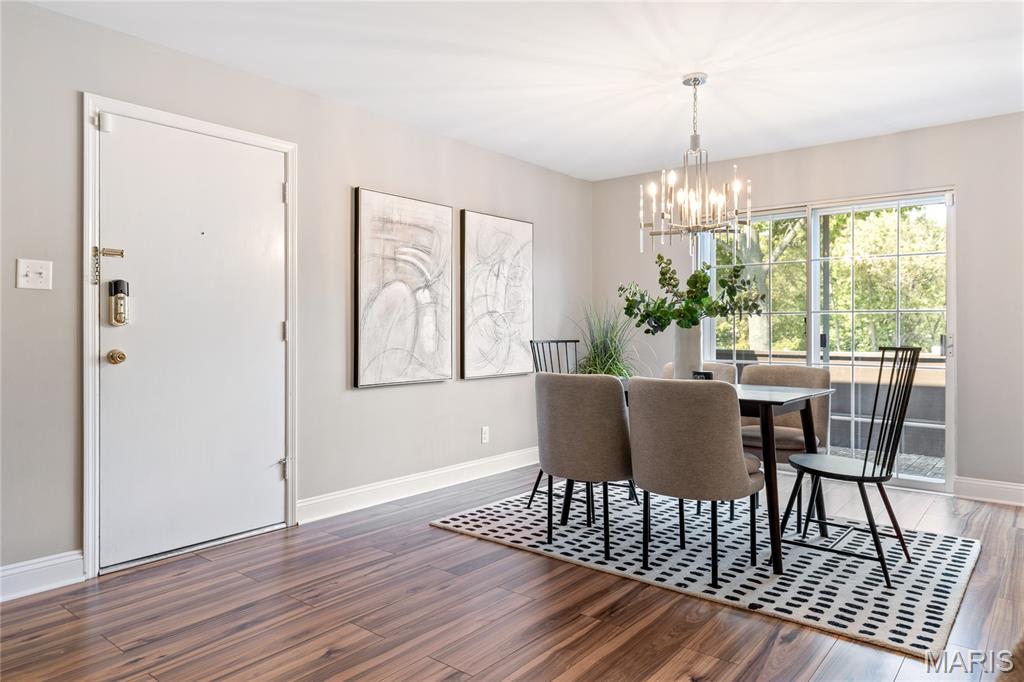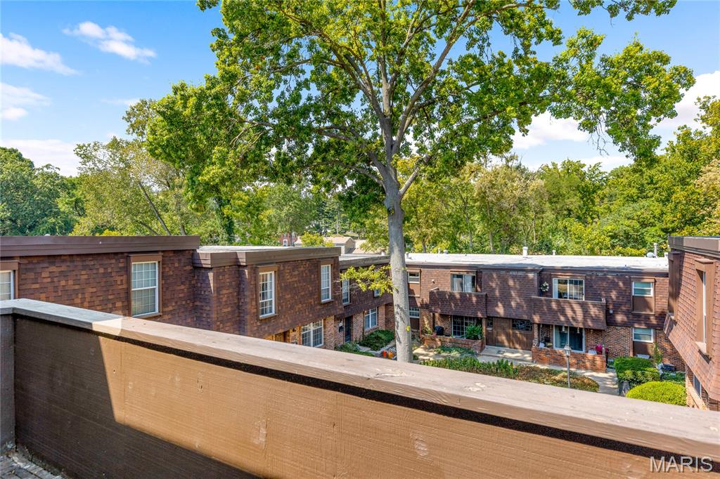 Spectacular renovation! This sophisticated 1-level condominium features an open floor plan designed to accommodate easy living & gracious entertaining. Spacious living room with fireplace flanked by built-in bookcases adjoins light-filled dining room with French sliding glass door that opens to private balcony overlooking lovely courtyard. Updated kitchen is a chef’s delight with white Shaker cabinetry, Carrara marble countertops & premium stainless steel appliances. Master bedroom suite with 2 double closets & marble bath plus a generous-sized additional bedroom & hall full bath  complete the living quarters. Amenities include clubhouse, pool, 1 garage space & storage unit. Convenient Chesterfield location within walking distance of shopping, restaurants & Faust Park with easy access to Hwy 40.