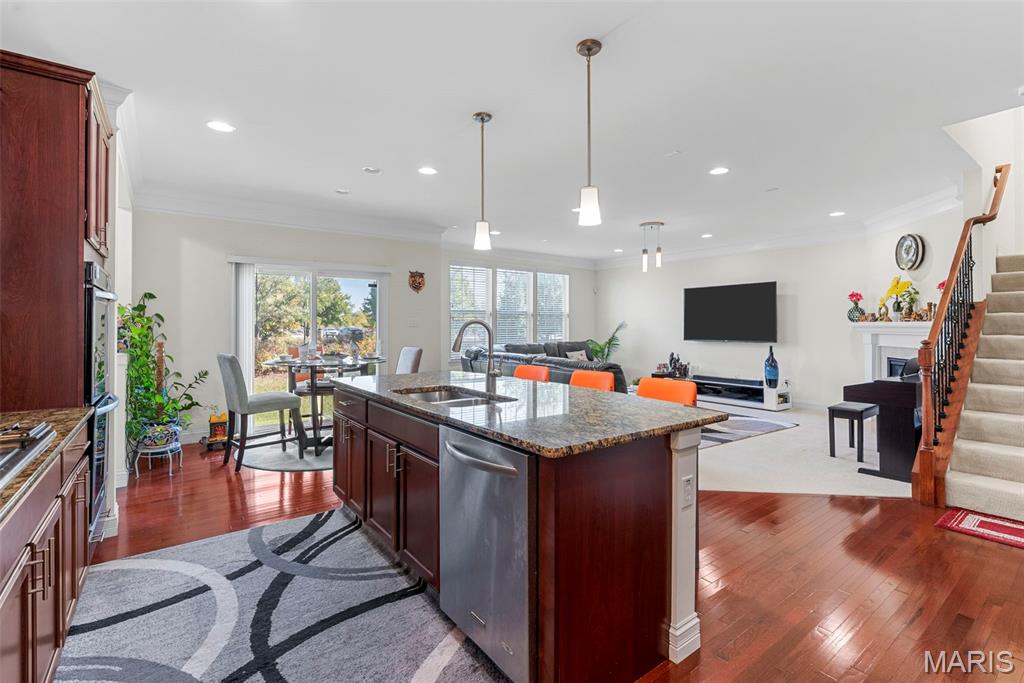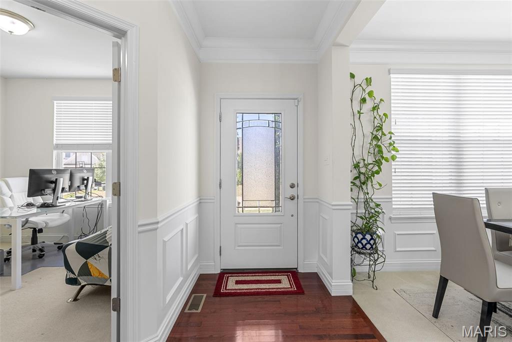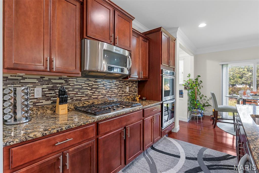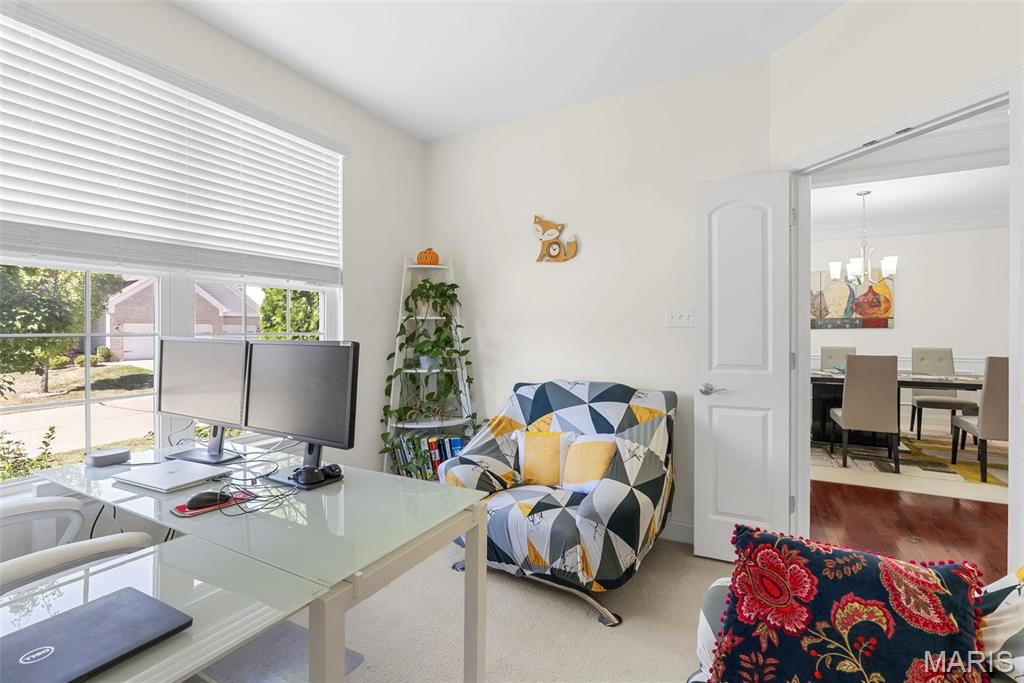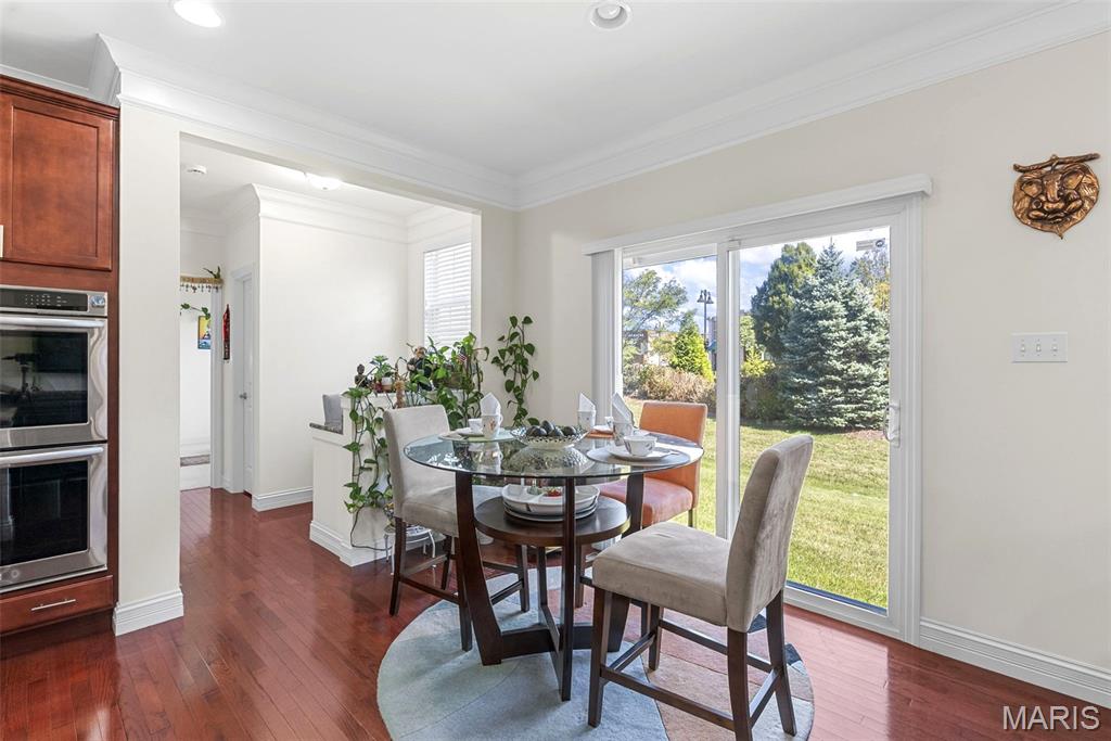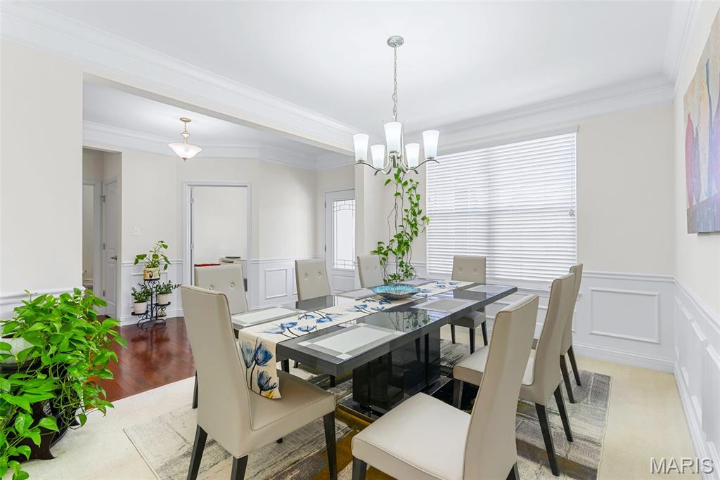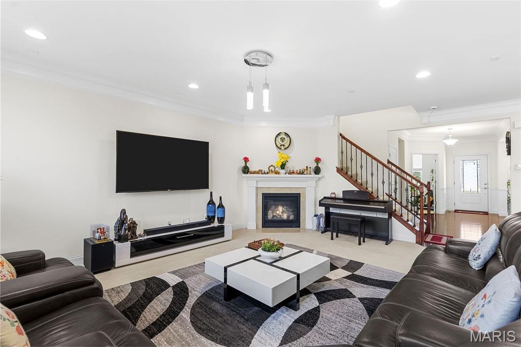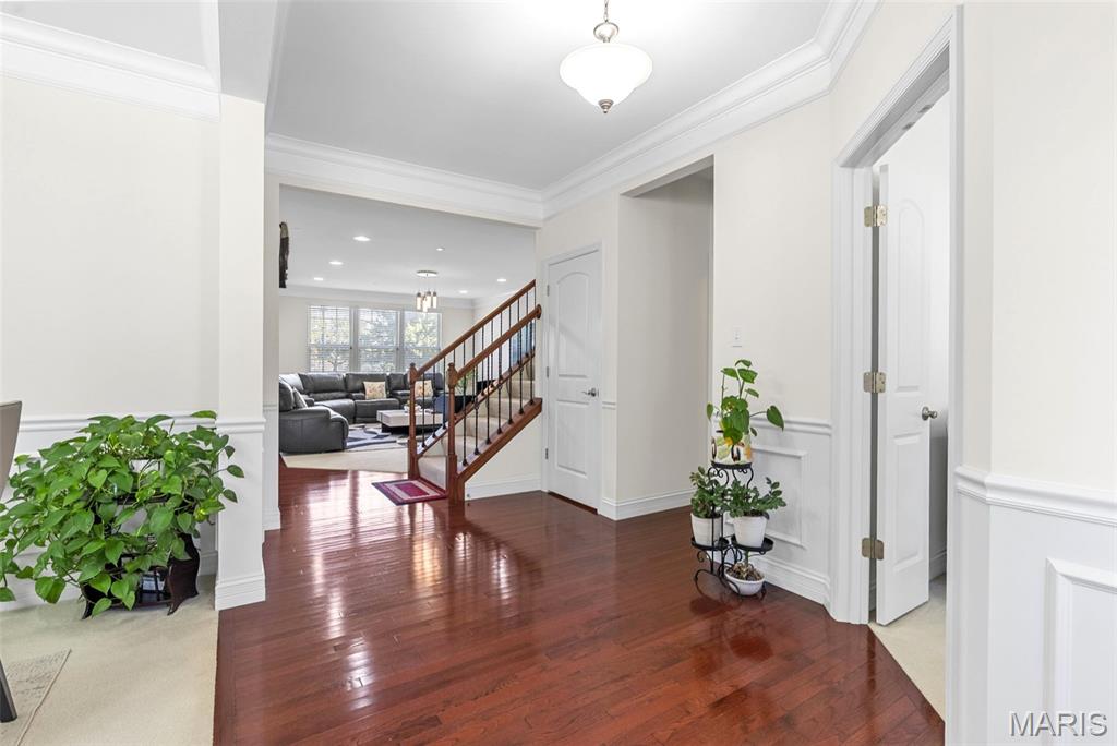 Welcome to 718 Savannah Crossing Way, where contemporary elegance meets everyday comfort in one of Chesterfield's most sought-after communities. Experience the best of both worlds: live close to everything you love in West St. Louis County - shopping, dining, parks, and major highways - then come home to tranquility. This stunning 4-bedroom, 2.5-bathroom home offers 3,248 square feet of thoughtfully designed space in the prestigious Estates at Town & Country Crossing. Built in 2014, this meticulously maintained residence showcases quality at every turn and is priced competitively for today's market. Step inside to an inviting open floor plan bathed in natural light, where the Great Room flows seamlessly into the gourmet kitchen featuring granite countertops, maple cabinets in rich espresso tones, built-in stainless steel appliances, gas cooktop, French door refrigerator, and a generous island perfect for casual dining or entertaining. The main level features elegant hardwood flooring, while upstairs bedrooms are carpeted for comfort. Throughout the home you'll find crown molding and custom trim details, a dramatic staircase with modern handrail and wrought iron spindles, recessed lighting throughout, and a gas fireplace creating the perfect ambiance in the living room. Enjoy year-round comfort with zoned heating and cooling and modern house systems. Upstairs, the primary bedroom suite offers a peaceful sanctuary with "his" and "hers" separate walk-in closets and a private ensuite bath. Three additional well-sized bedrooms and another full bath provide plenty of space for family, guests, or home office needs. Additional spaces include a main-level office/study, a casual breakfast area, a convenient kitchen nook, and a versatile bonus room tucked behind the kitchen. The unfinished basement offers incredible potential to create your dream home theater, gym, playroom, or a guest suite. The spacious 3-car attached garage provides ample storage and convenience. This home is situated within the highly-rated Parkway C-2 school district serving Henry Elementary, West Middle, and Parkway West High School. Built in 2014, this home has been meticulously cared for by the original owners and is move-in ready.