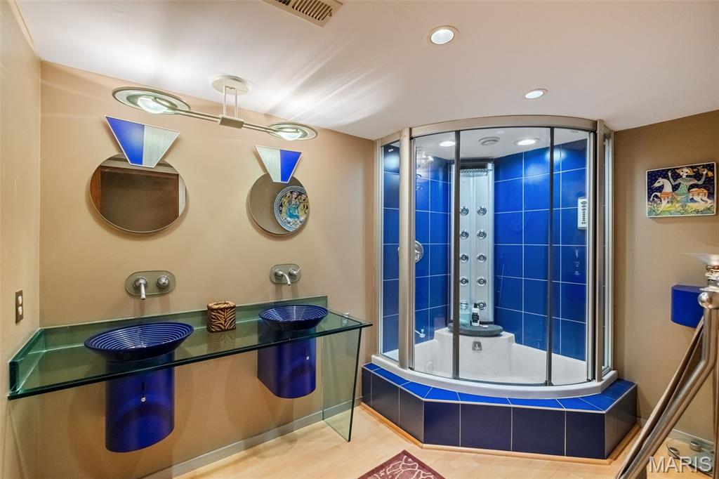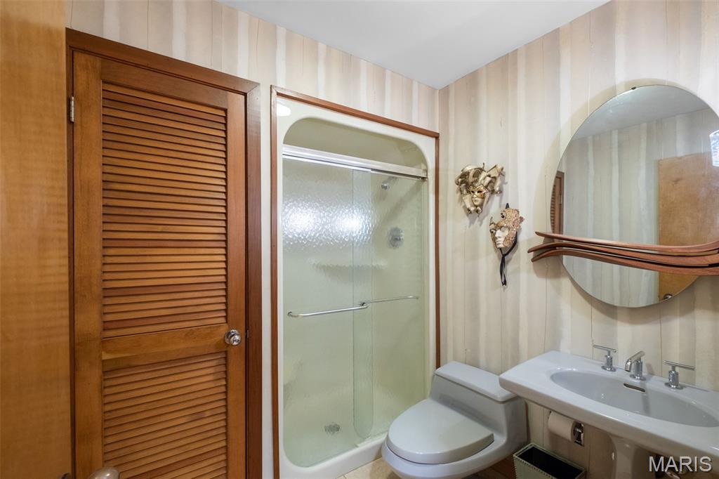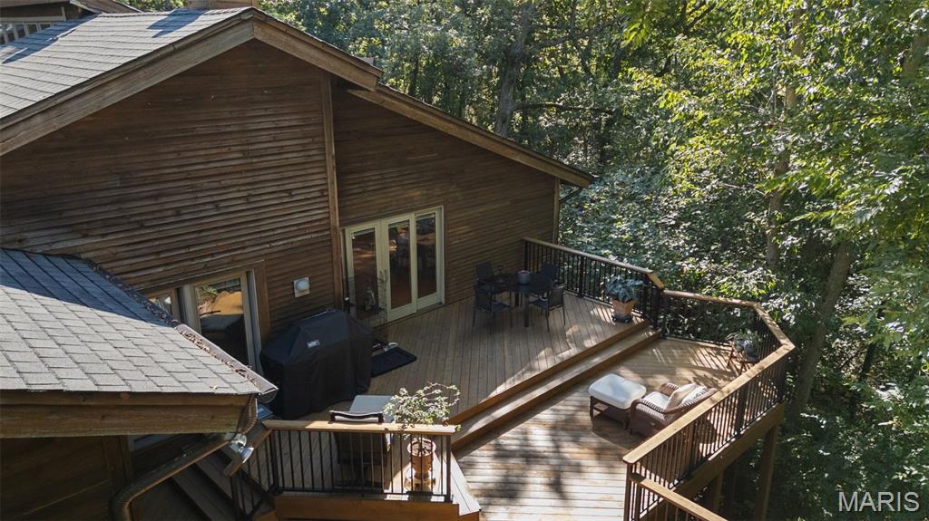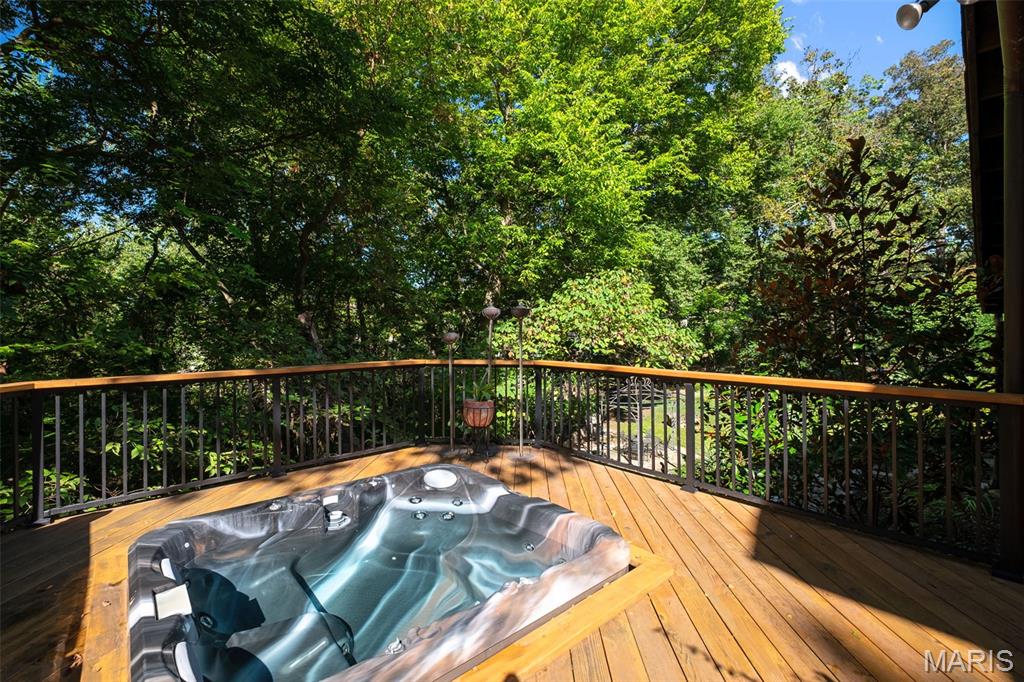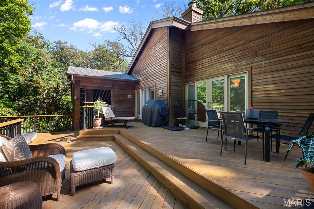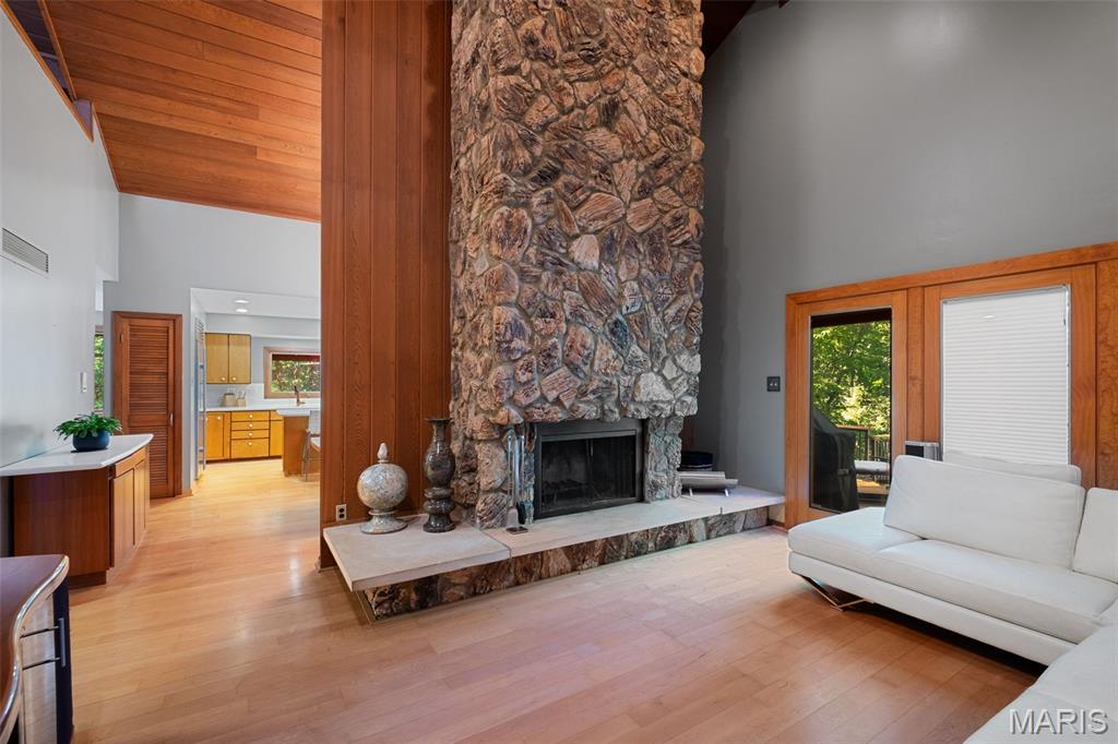 This is a unique find! Great rehab or build your dream home. A private gated drive leads you to this contemporary ranch set on 3.18 private acres with natural wooded land and bountiful gardens right in the heart of Chesterfield! Soaring vaulted teak ceilings, cedar beams, and floor-to-ceiling windows frame lush views at every turn. An organic entry foyer welcomes you, complete with an atrium, water feature, and access to a loft space. On the main level, the expansive primary suite walks out to a wrap around cedar deck and offers a primary bath featuring a double sink vanity, sunken Jacuzzi whirlpool, pellet stove, and walk-in shower — the ultimate in relaxation and style. Entertain easily with an open layout flowing from the living room to the dining area and kitchen, while a great room with a stone fireplace opens onto newer multi-level cedar decks with a built-in spa overlooking the wooded surroundings. The lower level walk-out includes a family room, rec room, three additional bedrooms, a full bath, and abundant storage. Features include hardwood and travertine flooring, custom interior doors, and teak accents. Three-car covered carport, public water, private septic system, and no subdivision constraints make this property uniquely private yet accessible. This home offers rare acreage, elegance, and serenity just minutes from Chesterfield’s amenities. Don’t miss this special opportunity.