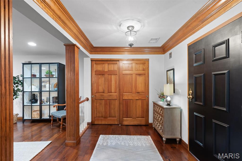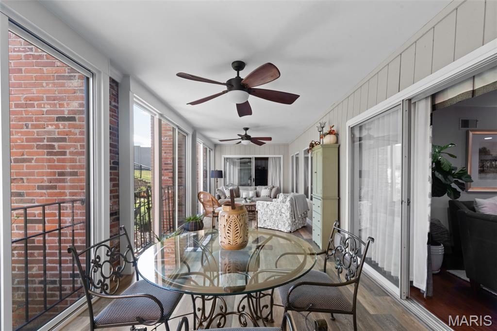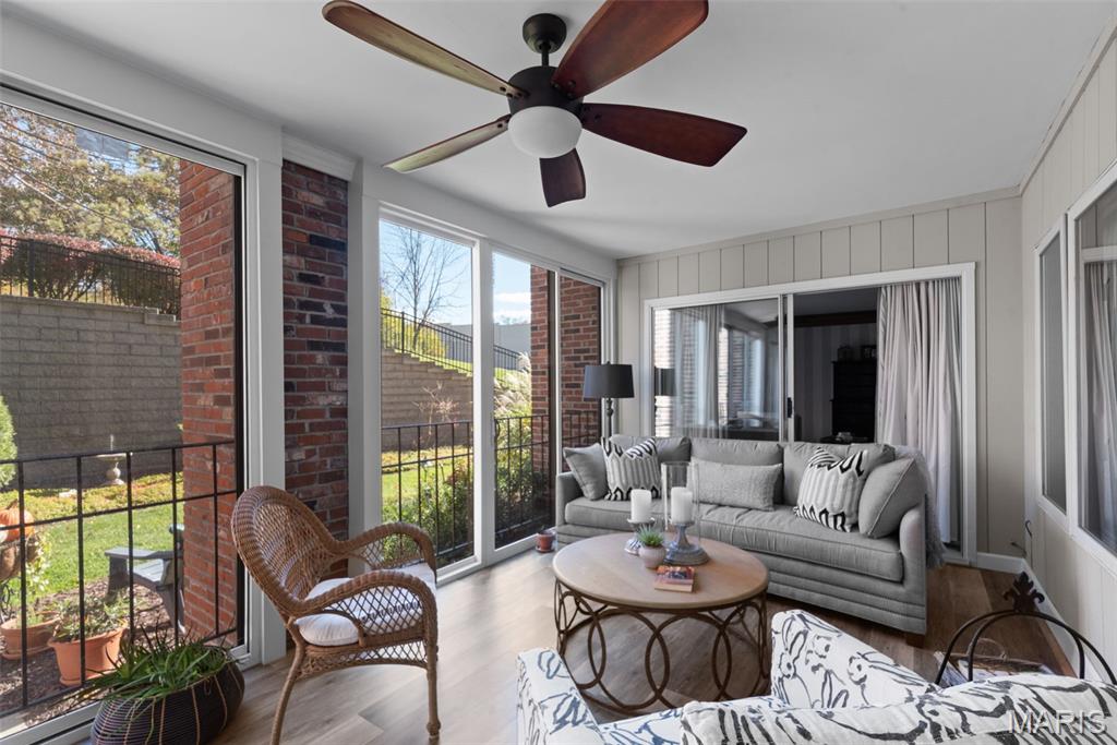 Spacious condo nestled in the desirable gated community of Conway Meadows! This beautifully maintained first-floor unit offers comfort, convenience, and style with an open floor plan and elegant millwork throughout. Gorgeous hardwood flooring flows through the main living areas, while the large sun porch—featuring windows and screens added in 2015—opens to beautifully landscaped common grounds, perfect for relaxing or entertaining. The upgraded kitchen, remodeled in 2014, features modern cabinetry, quality appliances, and ample counter space. Both baths have been tastefully updated, including a luxurious primary bath with a large walk-in shower completed in 2023, and a guest bath remodel in 2014. The primary suite also offers a spacious walk-in closet, and there’s excellent additional storage with two separate storage units. Freshly painted and move-in ready, this home combines modern updates with timeless comfort. Enjoy the convenience of in-unit laundry, a private garage, and secure building access. Residents of Conway Meadows enjoy resort-style amenities including a pool, clubhouse, and tennis courts—all within minutes of Chesterfield’s top shopping, dining, and highways. A wonderful opportunity for easy, elegant living in a premier location!