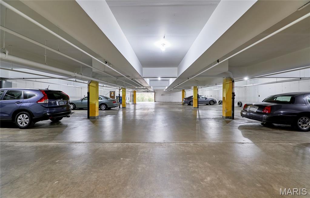 Welcome to this Beautiful first floor condo in the highly sought after Brandywine Community in Chesterfield! This unit is one of the largest in the subdivision with 1547 square feet, storage locker and one car garage in the basement with an elevator to get you there! Step into an open floor plan with beautiful wood flooring in the dining and living area with marble gas fireplace, the two doors leading to the patio have built in blinds. This units monthly fee includes $20 for the gas fireplace but if you choose not to use it, you could have it capped. There is an additional room being used as another sitting area, but it could be used for an office, a 3rd bedroom, if you add a door, or exercise room. The updated eat-in kitchen features granite countertops, white appliances, and a stylish backsplash, perfect for cooking and entertaining. The spacious primary suite includes a ceiling fan, elegant plantation shutters, walk-in closet and a private bath with dual sinks and walk in shower. The second bedroom is being used as an office also has plantation shutters. The second bath also has dual sinks. Enjoy zoned heating and cooling, plus the convenience of in-unit laundry. HOA fee includes water, sewer, lawn service, snow removal, and offers lush grounds, a sparkling lake with fountain, a swimming pool, and a club house, and indoor gathering areas creating a true retreat. Gather in the shared living space every Friday evening for Happy Hour to spend time with your neighbors. Located in Chesterfield, you are just minutes away from shopping, dining, and major highways. Don’t miss this incredible opportunity! Location: Ground Level!