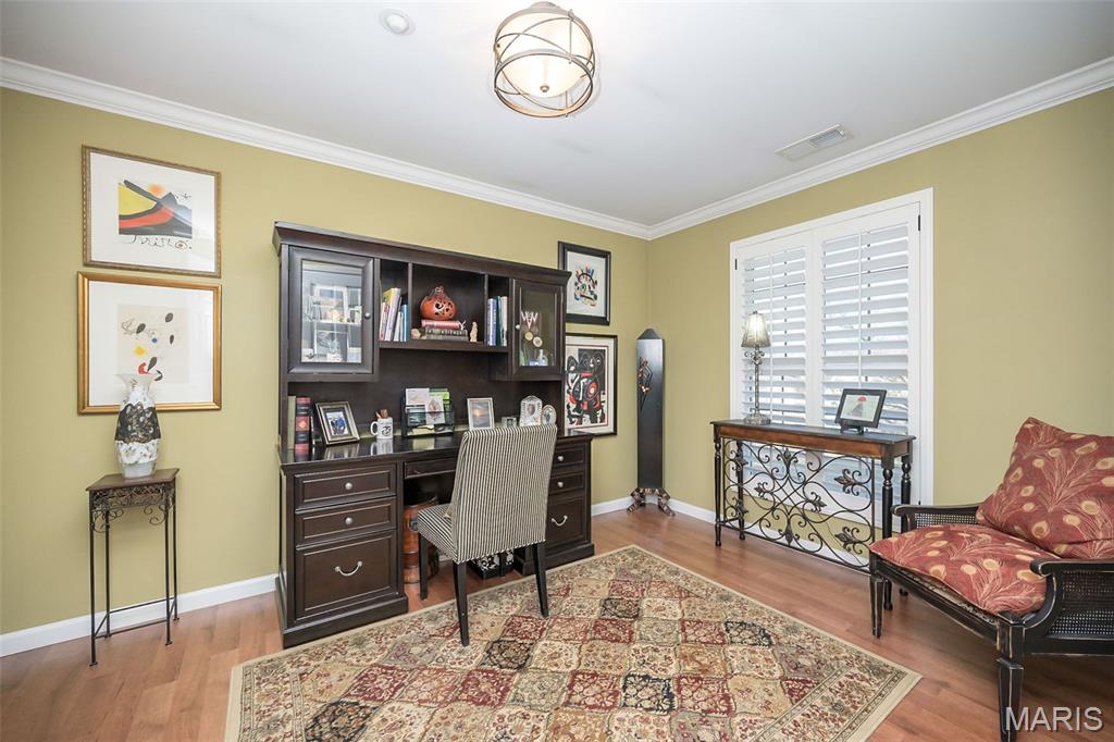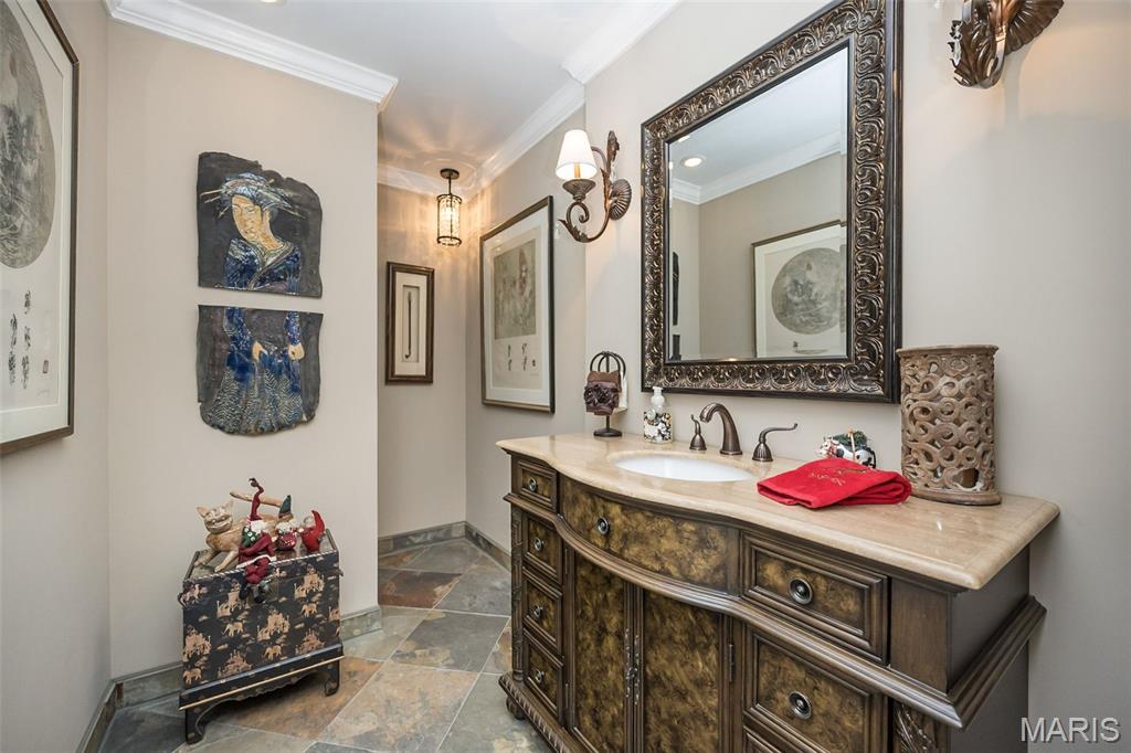 Exquisitely remodeled and thoughtfully designed, this spacious condo showcases upscale finishes and exceptional attention to detail throughout. Enter through beautiful wooden double doors into a slate foyer accented by crown molding, setting the tone for the refined interiors beyond. From the foyer, the home flows to the right into a stunning open-concept main living area, and to the left toward a private primary suite wing—offering an ideal balance of entertaining and retreat. The open-concept living space features a custom kitchen with contrasting wood cabinetry, double convection ovens, a 5-burner glass cooktop, and an expansive island—perfect for gatherings. Thoughtful upgrades include USB-equipped outlets and distinctive, upscale hardware. The adjoining great room is anchored by a full masonry gas fireplace and opens to a composite deck with peaceful pond views. A well-appointed dining area completes this inviting space. Also on this side of the condo are a den, a laundry room with ample built-in storage, and two bedrooms, each featuring upgraded finishes and enhanced lighting fixtures, a jack and jill bath with separate tub and shower, tiled to the ceilings with convenient insets. The private primary suite wing offers exceptional versatility and comfort, including a game room, secondary living room with a wet bar, and a dedicated home office. The wet bar features glass shelving, a composite sink, and granite countertops. The living room provides access to an additional composite deck and features a fireplace with a marble surround, with French doors leading to the primary suite and office on opposite sides. The spacious primary suite is a true retreat, highlighted by a chandelier, plantation shutters, an 11' deep walk-in closet with a custom Closet Company organizer, and a beautifully remodeled primary bath featuring a vessel bowl sink, adult height vanity and upscale finishes. Throughout the home, crown molding extends into the remodeled bathrooms, while all insulated windows are fitted with elegant plantation shutters. Recessed lighting throughout, rocker panels with dimmers for every lighting need. Dual HVAC systems and water heaters are new in 2025, as is the refrigerator. The building roof is new in December of 2025. There are 2 reserved parking spaces in the underground garage with easy elevator access. This renovated building has no curbs at the front parking area, and no steps to the elevator for exceptionally easy access. There is a beautiful lobby where residents gather, and the 3rd floor has a community reading room (or wine room, depending on your preference!) as well as a room for gatherings and parties. You can enjoy the pool in the summer and stroll the beautiful grounds around the community pond. Your pet is welcome in the Brandywine Community! Owners are allowed to have one dog that is under 45 pounds or one cat. And it's right around the corner from the dog park, Barnes and Noble, Dierbergs, Starbucks and more!! A rare opportunity to own a completely remodeled condo offering refined craftsmanship, custom details, and tranquil views—all designed for both comfort and style.