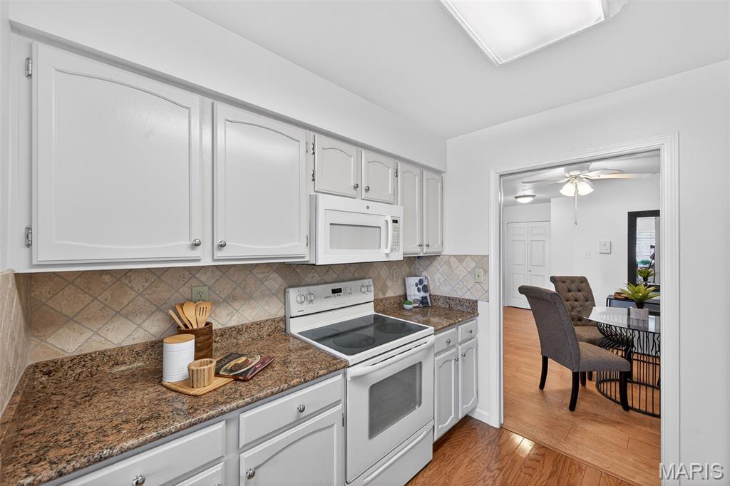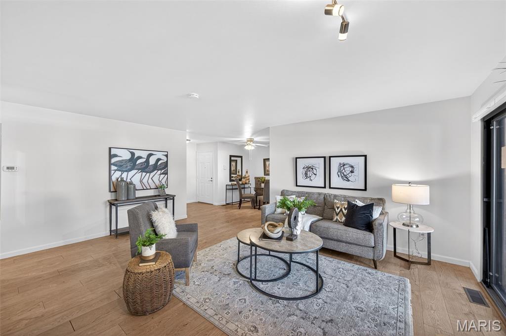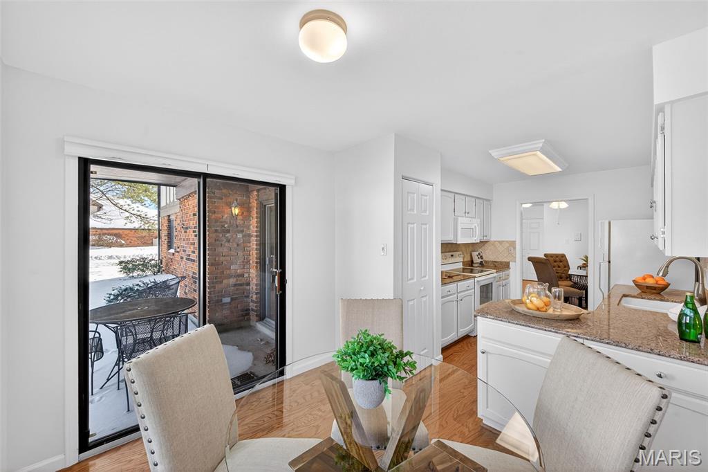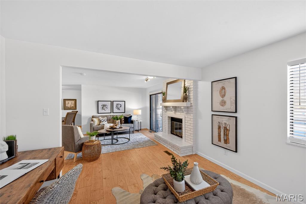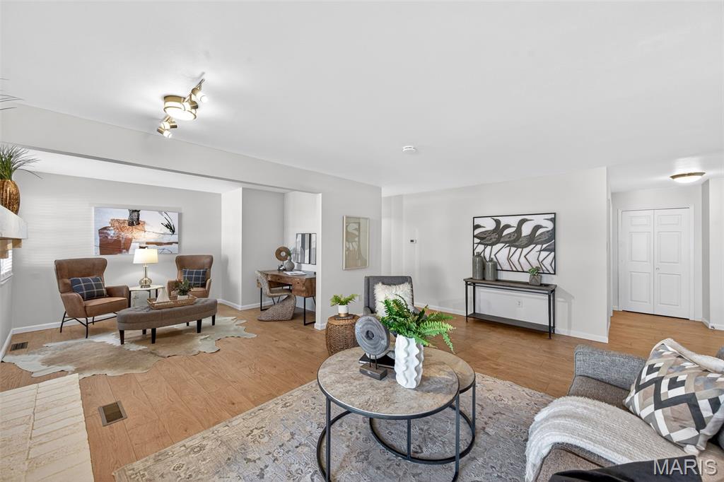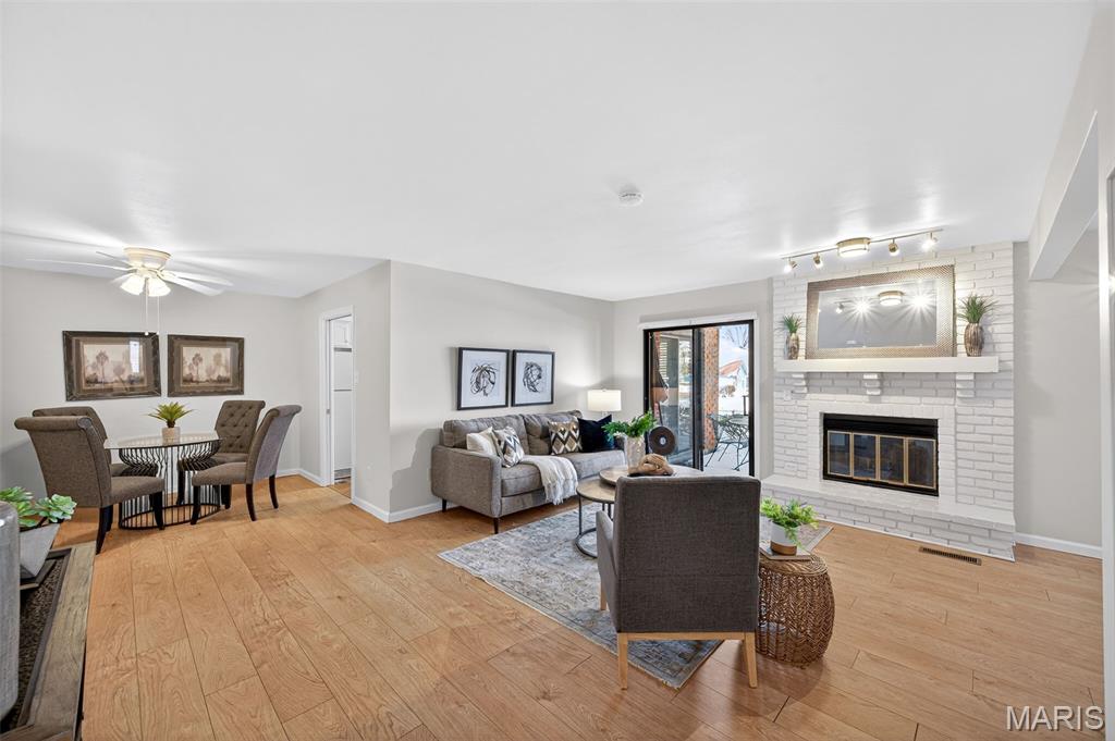 Beautiful 2 bedroom, 2 full bath MAIN level garden condo all on one level! This Ranch style condo is in the Windsor Manor subdivision conveniently located minutes from the new Urban Downtown Chesterfield area where there are so many exciting new things to experience! There are lots of restaurants, shopping, outlet mall, parks, walking paths, Butterfly House, Faust Park and so many fun entertainment places located in The District! This OPEN CONCEPT condo was freshly painted, has LVP throughout the main living areas, granite countertops, new microwave, a huge Utility Room and Primary Bedroom closet. It sits across the parking lot from the community pool, has a covered patio area and a 1 car attached garage with built-in shelves. The fireplace is being sold as is because it has not been used by the current owner. Water Heater replaced in 2022. HVAC replaced in 2020.