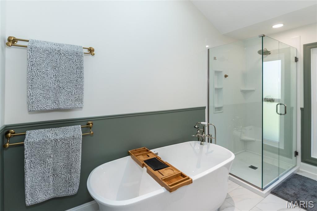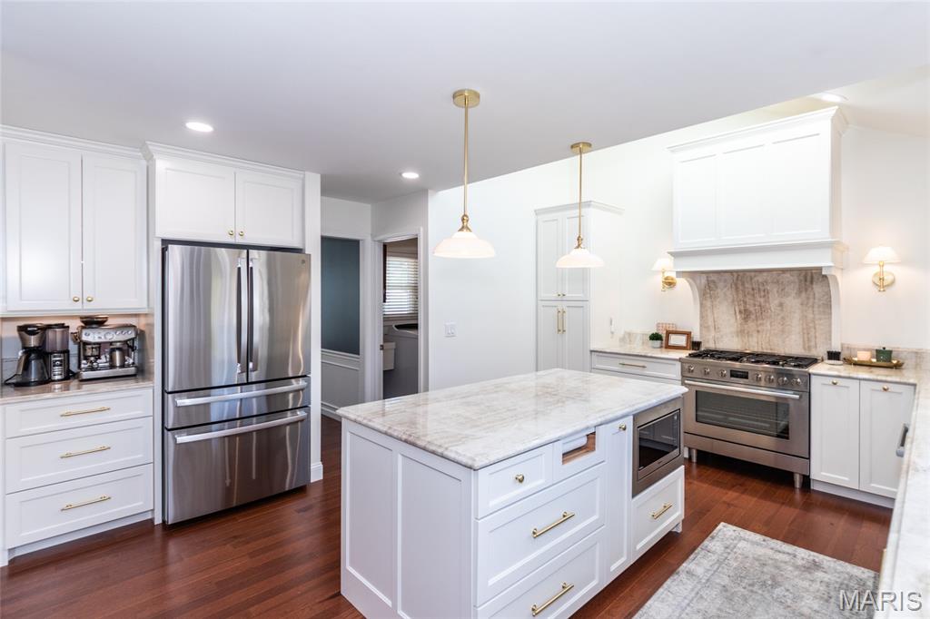 Located in desirable Chesterfield with quick Highway 40 access, this fully remodeled 2-story blends modern design, everyday function, and upscale finishes tailored for today’s lifestyle. The neighborhood elevates it even further with resort-style amenities including a community pool overlooking a scenic lake and tennis courts—perfect for active living and relaxed weekends close to home. Inside, fall in love with the exceptional hardwood flooring flowing throughout the entire main level, setting a warm yet sophisticated tone. The family room is both inviting and stylish with a statement fireplace, elegant bay windows, and plantation shutters, seamlessly connecting to the breakfast room and a trendy built-in bar serving area that’s ideal for hosting friends or unwinding after a long day. The breakfast room opens to a truly standout kitchen designed for those who appreciate craftsmanship and quality. Kitchen features high-end custom cabinetry with extensive built-ins, Taj Mahal Quartzite countertops, designer hardware, premium appliances, a dramatic custom range hood, and a spacious center island that anchors the space for cooking, gathering, and conversation. A formal dining room is ready for hosting dinner parties, while a flexible front room serves perfectly as a home office or reading area. Don't forget about a convenient main floor laundry room and stylish half bath—thoughtfully placed for daily ease and guest use. The rear of the home delivers a true wow moment, perched above expansive green space and offering peaceful views from both the screened-in porch and deck—an ideal setting for morning coffee, evening wine, or quiet outdoor relaxation. Upstairs, the primary suite feels like a private retreat with vaulted ceilings, brand new carpet (2026), and a beautifully remodeled spa-inspired bath featuring a large walk-in shower, separate soaking tub, dual vanities, and tile flooring. Three additional bedrooms with new carpet (2026), a versatile loft perfect for work, gaming, or study space, and a refreshed hall bath complete the upper level. The walkout lower level provides excellent future potential for added living space, fitness area, or media room. Additional highlights include a newer roof (2023), replaced windows on main and upper levels plus lower level sliding door, oversized 2-car garage, irrigation system, spacious yard & much more! Modern updates, flexible living spaces, and scenic surroundings make this home a rare opportunity that checks every box.