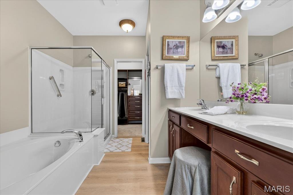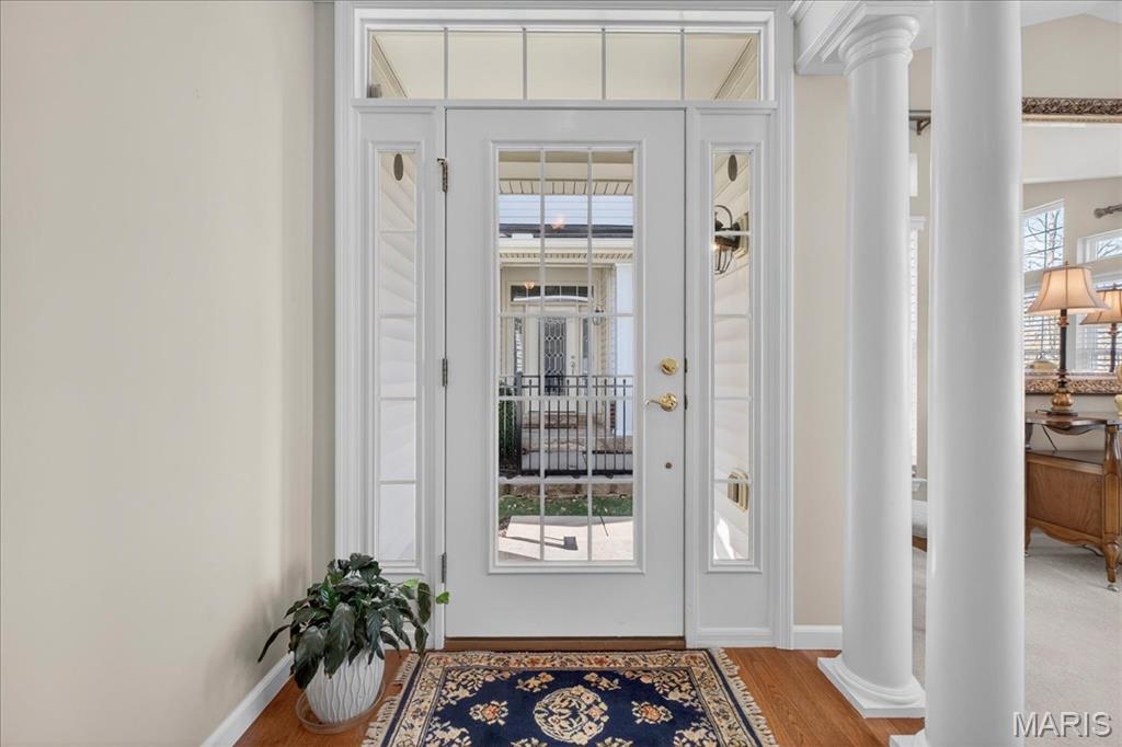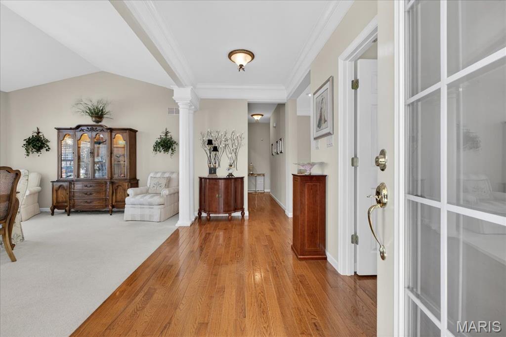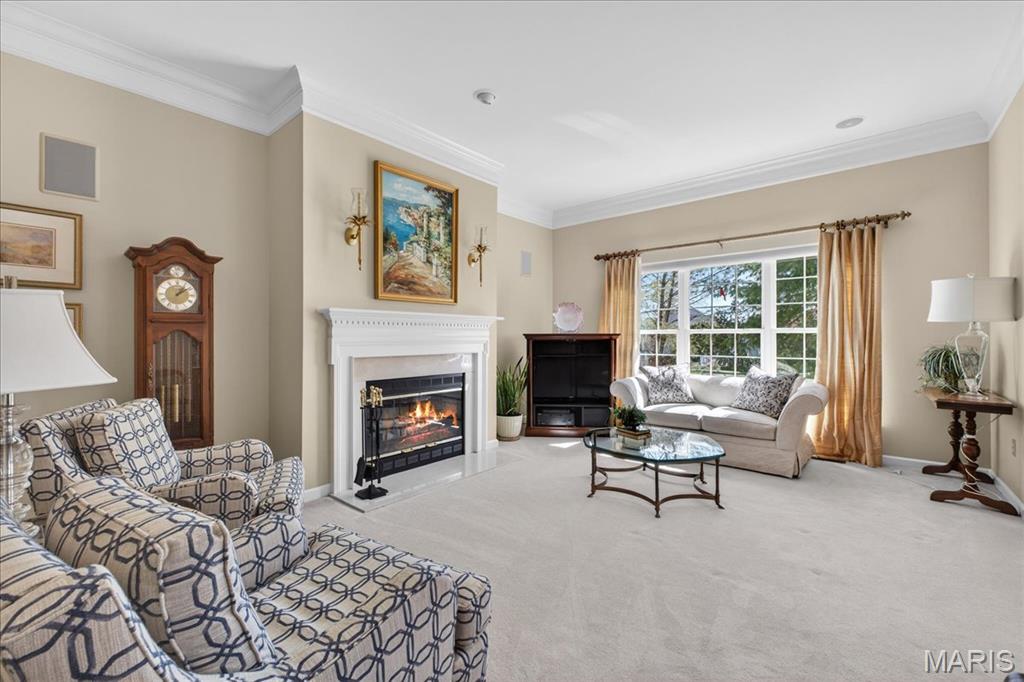 Nestled on a private street in the gated community of the Villas at Nooning Tree, this bright and welcoming villa offers beautiful lake views and an easy, carefree lifestyle. The main level features 10’ ceilings, hardwood flooring, and neutral carpeting throughout. A grand living room with multi-vaulted ceilings and a dramatic wall of windows showcases the long lake view and offers flexible use as an elegant entertaining or expanded dining space. The inviting family room with a cozy fireplace flows seamlessly into the kitchen and out to the large composite deck—perfect for relaxing or gathering with friends. The dine-in kitchen features custom wood cabinetry, stainless steel appliances, a center island, and pantry. The spacious main floor primary suite includes an ensuite bath with double vanity, soaking tub, separate shower, and a generous walk-in closet with custom organizers. The main floor is completed by a powder room, laundry room, and a 2-car garage with an additional overhead storage shelf. The finished lower level expands the living space with a large recreation room, office nook, bedroom, and full bath—ideal for guests. A full-length storage area offers abundant shelving and a dedicated workbench space. Impeccably maintained and thoughtfully designed, this villa blends comfort, elegance, and functionality in a peaceful gated setting.