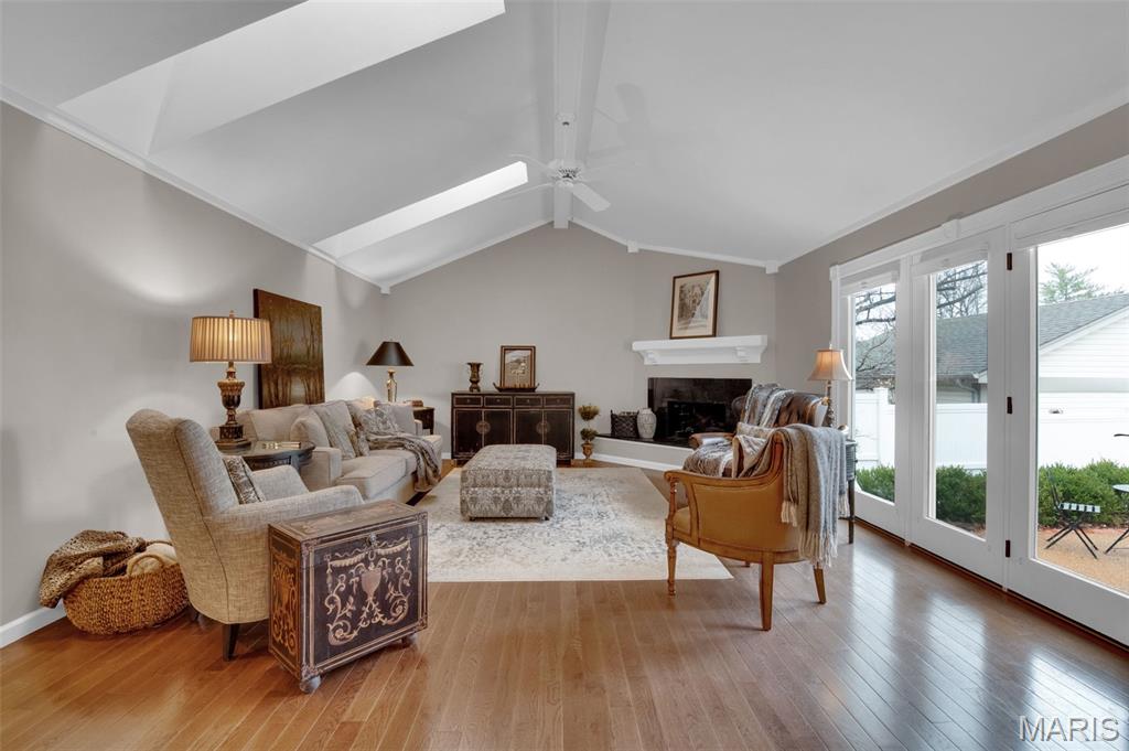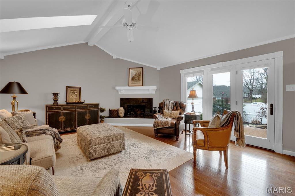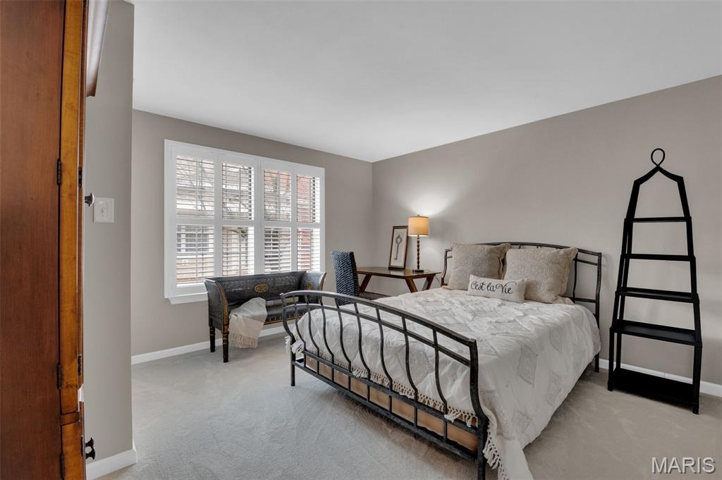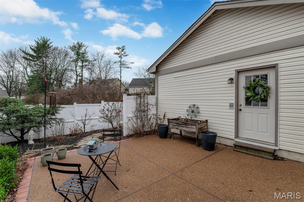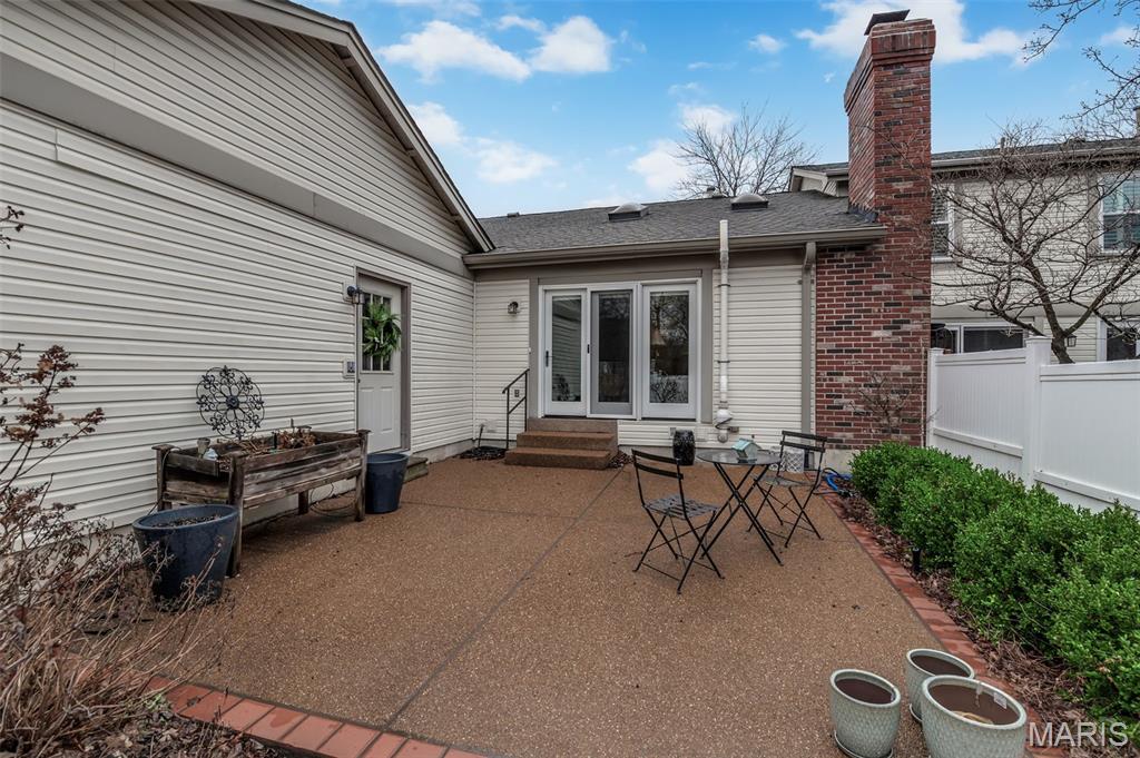Beautifully maintained end-unit villa offering 2 bedrooms, 2.5 baths, and a 2-car garage in the highly desirable Villages at Baxter Ridge. This home combines low-maintenance living with thoughtful design and functional main-level layout. The main floor features a formal dining room with wood flooring and a spacious great room highlighted by skylights, a fireplace, and direct access to a private patio. The kitchen offers white cabinetry, stainless steel appliances, double sink, eat-in breakfast area, and convenient access to the attached garage. Main-floor laundry adds everyday convenience. Both bedrooms are located on the main level. The primary suite is generously sized with a bay window, plantation shutters, vaulted ceiling, ceiling fan, neutral paint, and carpeting. The en-suite bath features double vanities, a separate soaking tub, and separate shower, both with glass enclosures. The guest bedroom includes a large window and ample closet space. The finished lower level provides additional living space ideal for recreation, media, office, extra sleep, or hobby use, along with a half bath for added functionality. The private outdoor space serves as a true extension of the home with an aggregate patio, mature landscaping, and a 6-foot white vinyl privacy fence. Unique driveway access to the patio area enhances flexibility and convenience. Located in a prime Chesterfield setting close to shopping, dining, and major highways, this villa offers comfort, privacy, and accessibility in one of West County’s most convenient corridors.