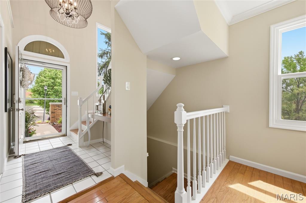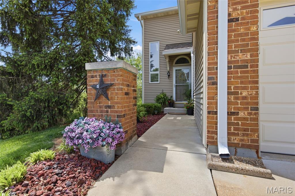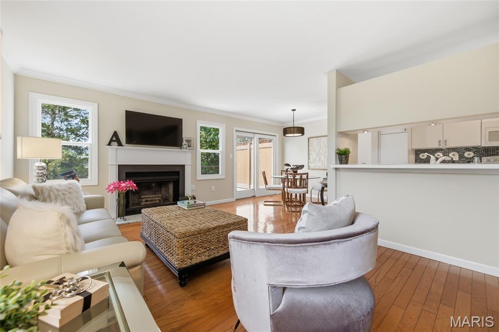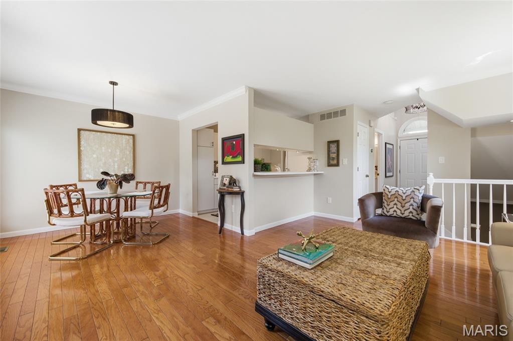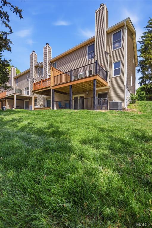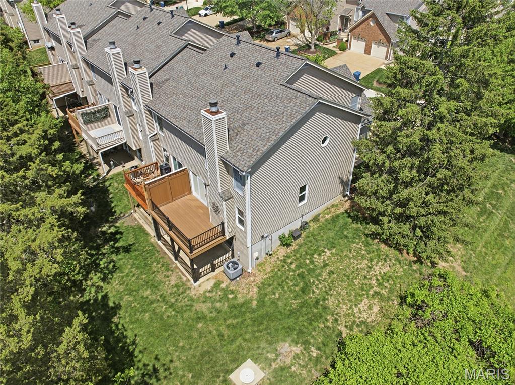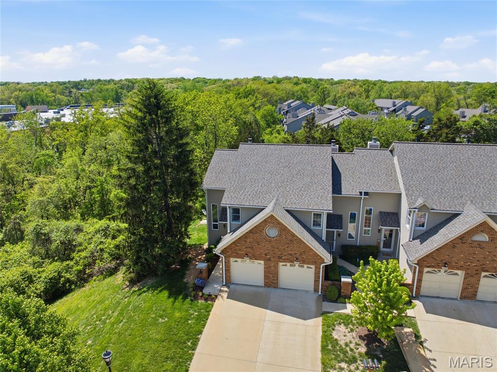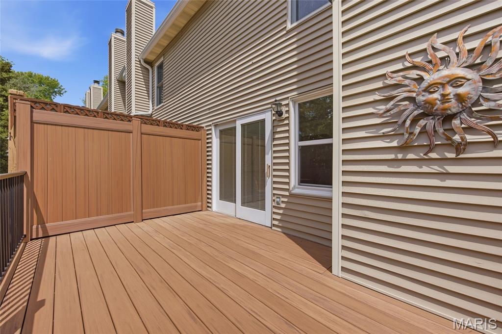 Coveted end unit with 3 exposures brings about a light and bright townhouse with only one shared wall in the heart of Chesterfield’s desirable Clarkson Grove! A rare, private entrance leads to a dramatic 2 story entry and 1,850+ sqft of updated living space, next to subdivision common ground. The open-concept main level features gleaming hardwood floors, a cozy wood burning fireplace and open kitchen. Enjoy seamless indoor-outdoor living on one of the largest decks in the complex - a newer (2024) maintenance free composite type with aluminum railings. In addition, a lower-level patio offers privacy overlooking tree lined grounds! The spacious vaulted primary suite offers two closets with new closet organizer (2025) and a large luxurious bath with a newer vanity and soaking tub. A finished lower level includes either a 3rd Bedroom or a large rec/hobby room. The lower level also has a full bath, walk-in closet and leads to the private patio. Main floor laundry and private, attached garage. HOA fee includes the pool, lawn care, sewer, water, trash, and snow removal. Washer, dryer, & refrigerator included. New roof (11/2025) and new siding and gutters coming soon (2026), freshly painted (2026), new outlets and light switches (2026). Walk to Trader Joes, Dierbergs, 2 book stores, restaurants and more! Steps from Chesterfield's new development, Downtown Chesterfield! Top-rated parkway schools and a vibrant community offers convenient, easy access to I-64. Move in and enjoy low-maintenance, effortless living in one of Chesterfield’s most sought-after communities!