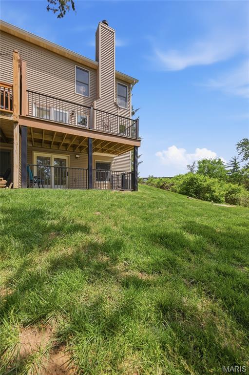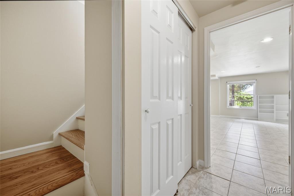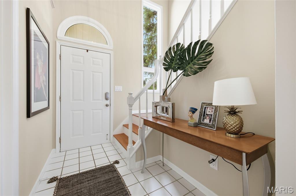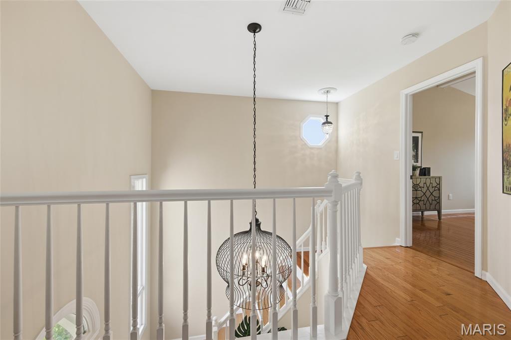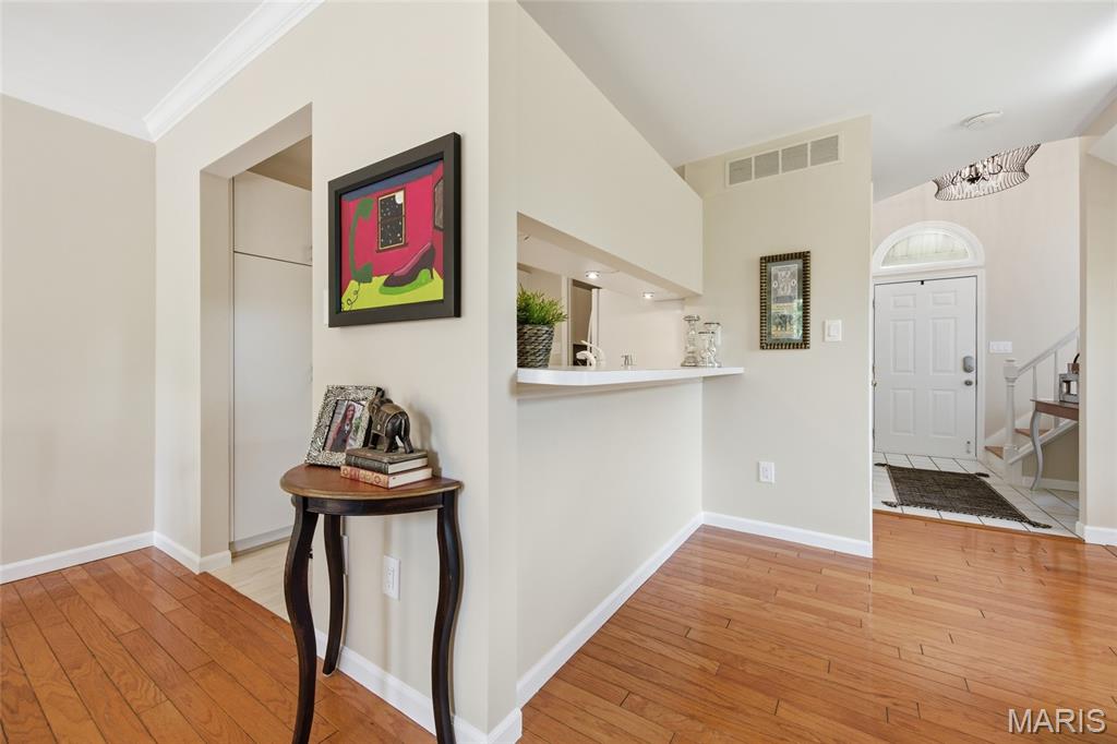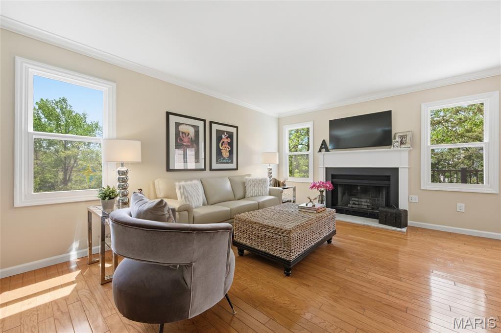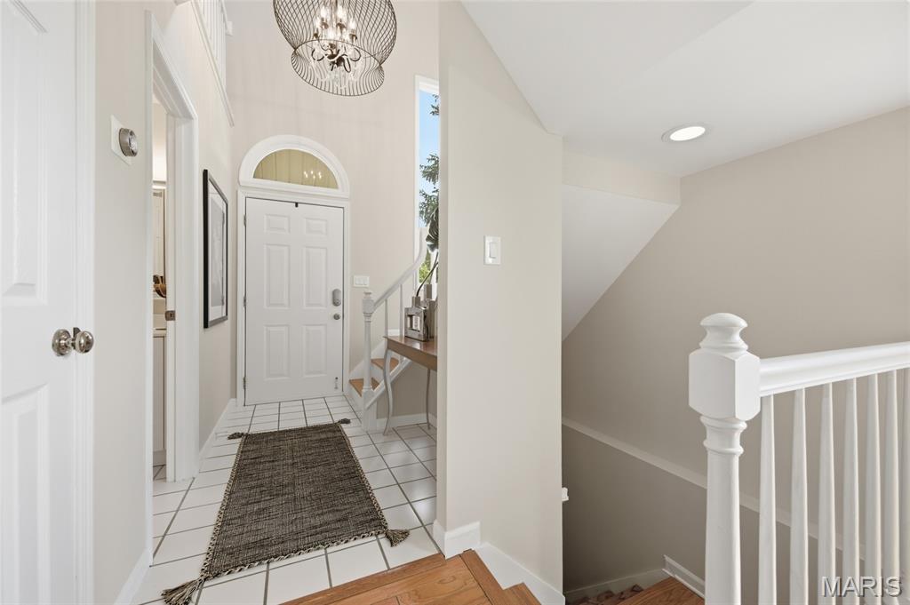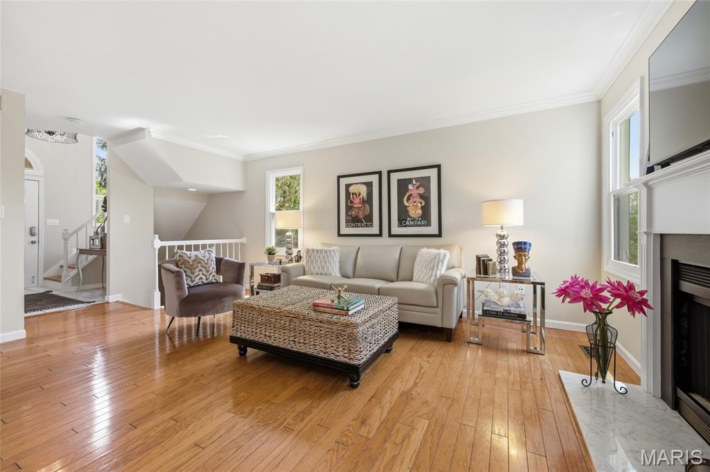 Coveted end unit with 3 exposures brings about a light and bright townhouse with only one shared wall in the heart of Chesterfield’s desirable Clarkson Grove! A rare, private entrance leads to a dramatic 2 story entry and 1,850+ sqft of updated living space, next to subdivision common ground. The open-concept main level features gleaming hardwood floors, a cozy wood burning fireplace and open kitchen. Enjoy seamless indoor-outdoor living on one of the largest decks in the complex - a newer (2024) maintenance free composite type with aluminum railings. In addition, a lower-level patio offers privacy overlooking tree lined grounds! The spacious vaulted primary suite offers two closets with new closet organizer (2025) and a large luxurious bath with a newer vanity and soaking tub. A finished lower level includes either a 3rd Bedroom or a large rec/hobby room. The lower level also has a full bath, walk-in closet and leads to the private patio. Main floor laundry and private, attached garage. HOA fee includes the pool, lawn care, sewer, water, trash, and snow removal. Washer, dryer, & refrigerator included. New roof (11/2025) and new siding and gutters coming soon (2026), freshly painted (2026), new outlets and light switches (2026). Walk to Trader Joes, Dierbergs, 2 book stores, restaurants and more! Steps from Chesterfield's new development, Downtown Chesterfield! Top-rated parkway schools and a vibrant community offers convenient, easy access to I-64. Move in and enjoy low-maintenance, effortless living in one of Chesterfield’s most sought-after communities!