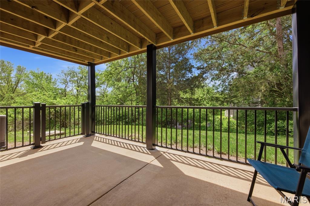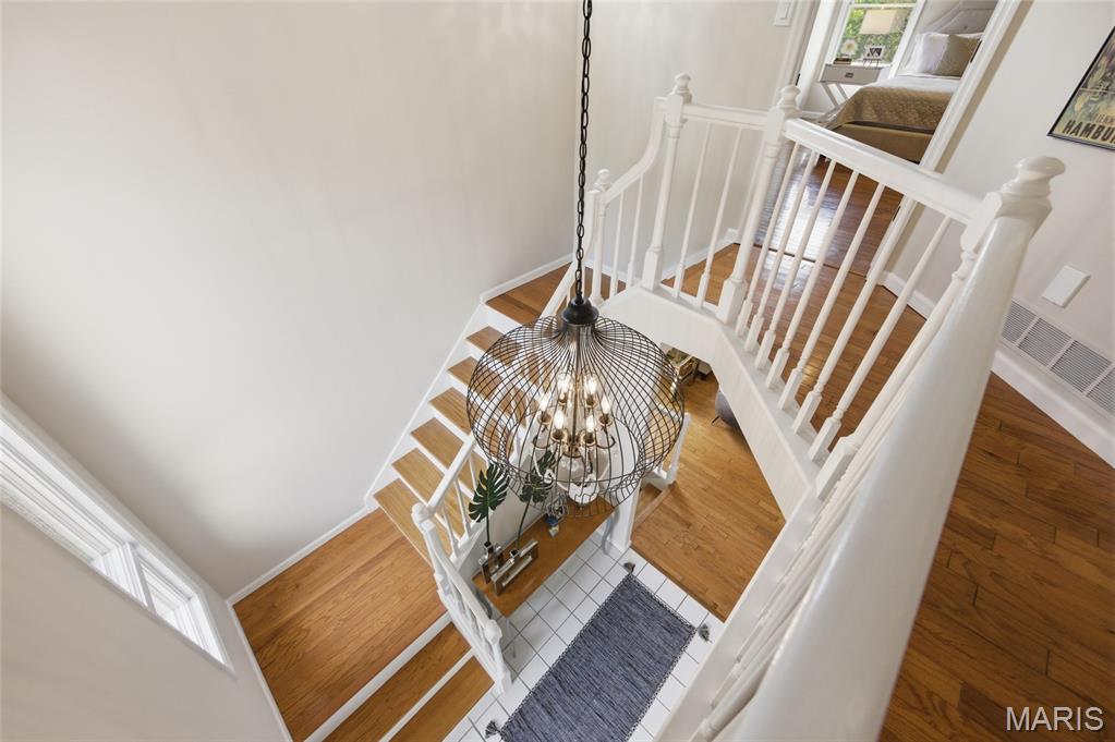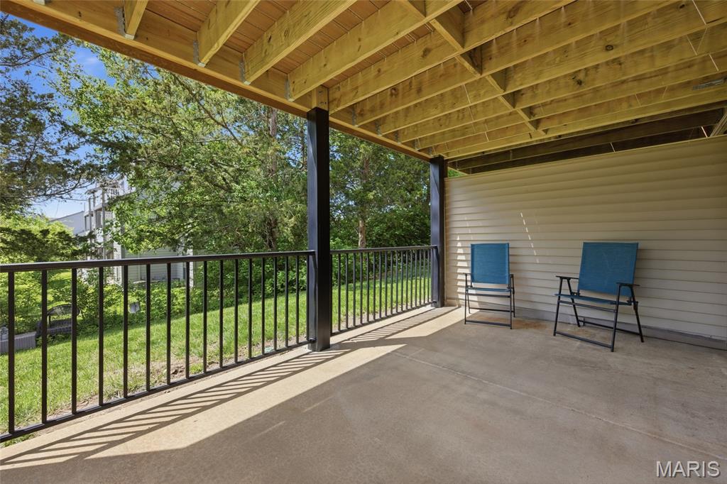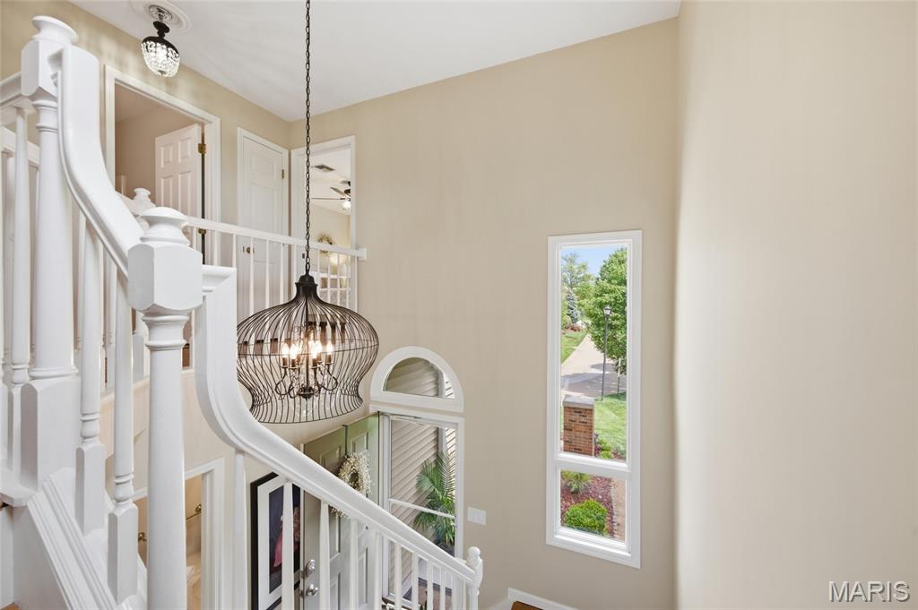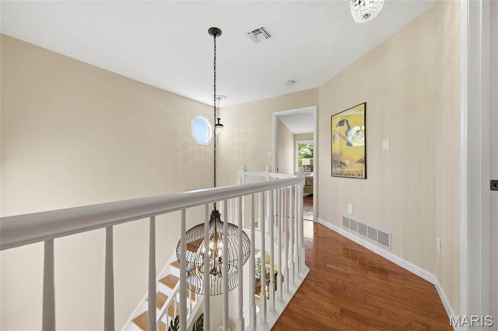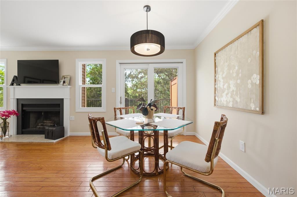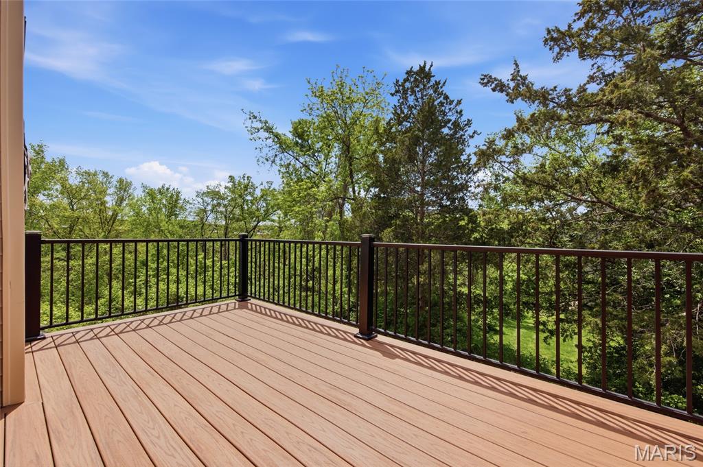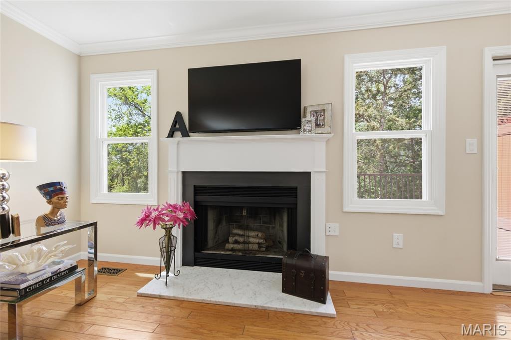 Coveted end unit with 3 exposures brings about a light and bright townhouse with only one shared wall in the heart of Chesterfield’s desirable Clarkson Grove! A rare, private entrance leads to a dramatic 2 story entry and 1,850+ sqft of updated living space, next to subdivision common ground. The open-concept main level features gleaming hardwood floors, a cozy wood burning fireplace and open kitchen. Enjoy seamless indoor-outdoor living on one of the largest decks in the complex - a newer (2024) maintenance free composite type with aluminum railings. In addition, a lower-level patio offers privacy overlooking tree lined grounds! The spacious vaulted primary suite offers two closets with new closet organizer (2025) and a large luxurious bath with a newer vanity and soaking tub. A finished lower level includes either a 3rd Bedroom or a large rec/hobby room. The lower level also has a full bath, walk-in closet and leads to the private patio. Main floor laundry and private, attached garage. HOA fee includes the pool, lawn care, sewer, water, trash, and snow removal. Washer, dryer, & refrigerator included. New roof (11/2025) and new siding and gutters coming soon (2026), freshly painted (2026), new outlets and light switches (2026). Walk to Trader Joes, Dierbergs, 2 book stores, restaurants and more! Steps from Chesterfield's new development, Downtown Chesterfield! Top-rated parkway schools and a vibrant community offers convenient, easy access to I-64. Move in and enjoy low-maintenance, effortless living in one of Chesterfield’s most sought-after communities!